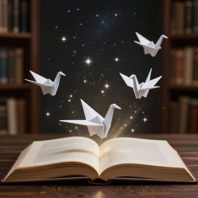 In a celestial library illuminated by ethereal starlight, origami cranes emerge from an open book, symbolizing stories unfolding into new lives through the magic of imagination and the transformative power of literature.