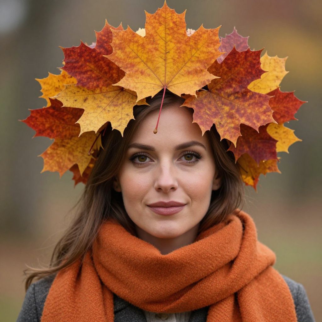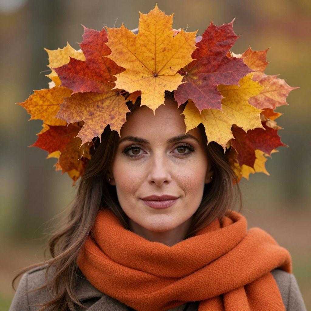 Photograph of a young woman with fair skin and brown hair, wearing a vibrant orange scarf and brown coat. She has a gentle smile and is adorned with a crown of colorful autumn leaves in shades of yellow, orange, and red. The background is softly blurred, featuring hues of green and brown, suggesting an outdoor autumn setting. The image has a warm, natural light, emphasizing the fall colors and textures of the leaves and scarf. The woman's makeup is subtle, with natural tones.