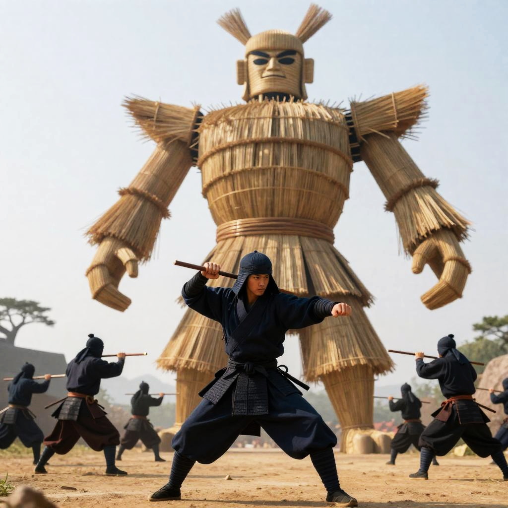 Amazing quality, masterpiece, best quality, hyper detailed, ultra detailed, UHD, perfect anatomy, portrait, dof, hyper-realism, majestic, awesome, inspiring, Bosstyle, feudal Ninja Fights brave against a giant colossus straw puppet boss, cinematic composition, soft shadows, national geographic style