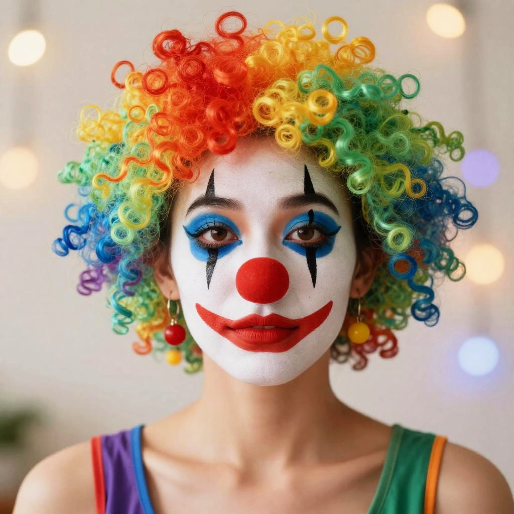 Clown filter portrait on a young woman, with exaggerated colorful face paint, red bulbous nose, curly rainbow wig, soft glowing background, dreamy bokeh lights, vivid hues contrasting with gentle shadows, creating a mysterious yet cheerful mood.
