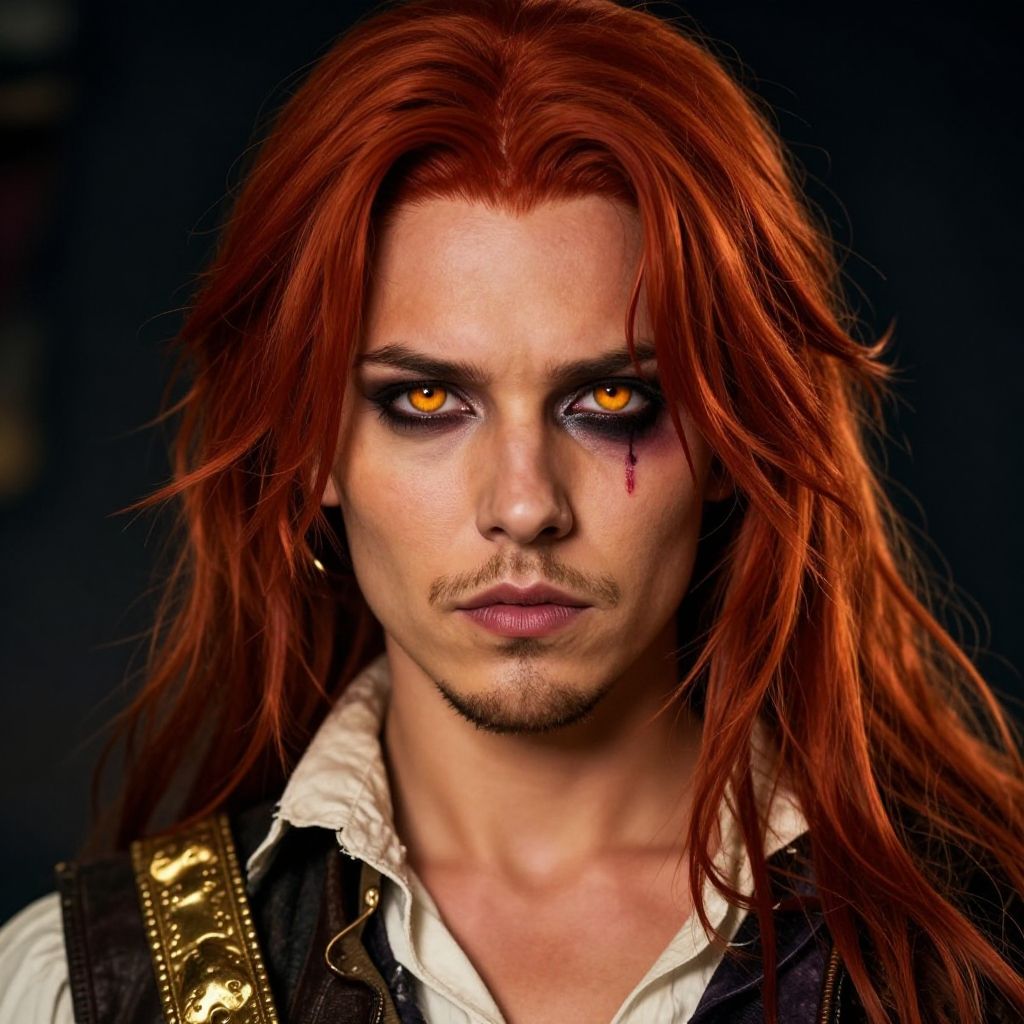 Photograph of a white man with long, red, slightly messy hair and amber eyes, wearing heavy black eye makeup with a small red scar on his right cheek. He has a thin goatee and is dressed in a white shirt with a black vest that has a golden, ornate strap. The background is dark, making his intense gaze and vivid hair color stand out. His expression is serious and slightly menacing, with a focus on his striking eye makeup and scar. The lighting highlights his facial features and hair.
