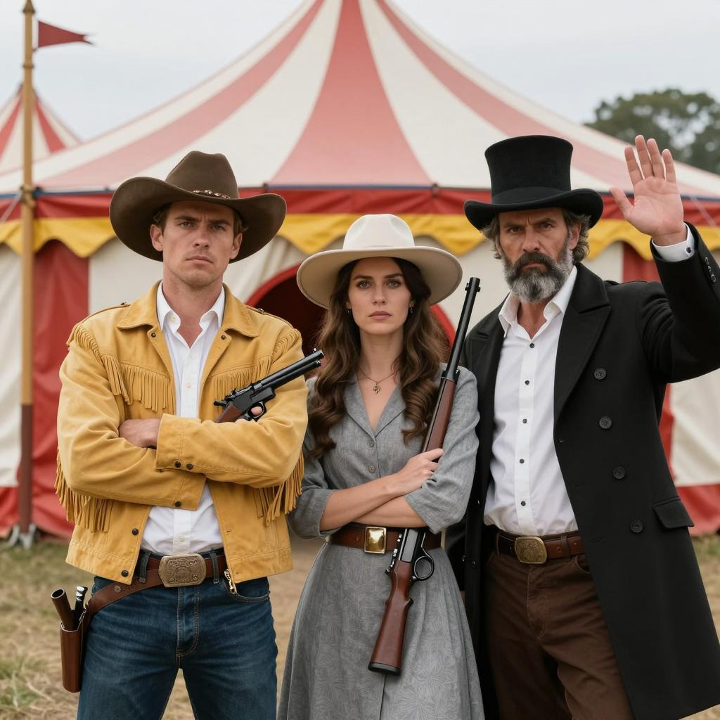 Digital composite of five people. Four men in the background wear cowboy hats, rugged clothing, and have intense facial expressions. Foreground features a close-up of a woman with wavy brown hair, intense gaze, and off-shoulder top. Distressed white border surrounds the group. Men have varied ages, beards, and serious expressions. Woman on the right. Blue-gray gradient background. Five individuals.