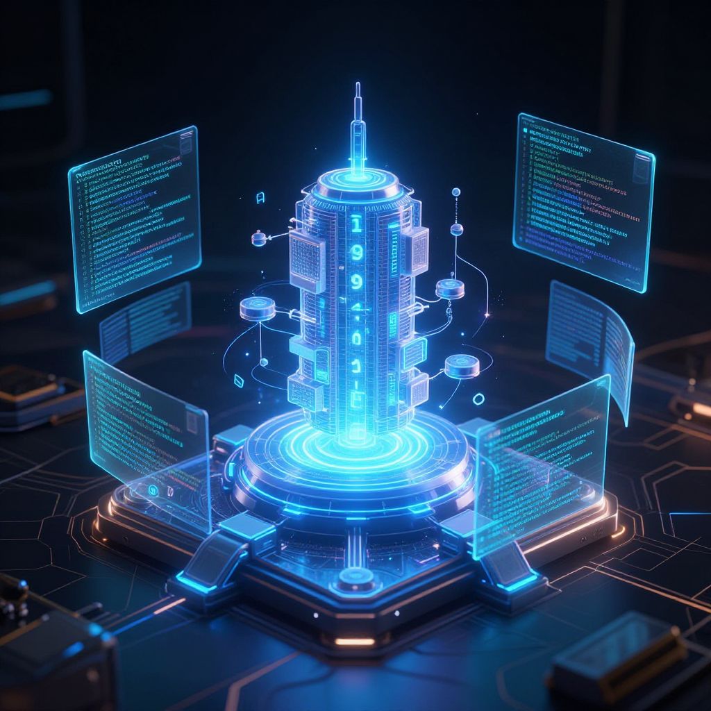 This CGI image depicts a futuristic, glowing blue holographic cylinder centered on a dark, circuit-like surface. The cylinder emits bright neon blue light and is surrounded by floating, semi-transparent holographic screens displaying code. Small, glowing blue orbs and lines connect to the cylinder, enhancing the high-tech, digital aesthetic. The background is dark, emphasizing the vivid blue hues and technological elements. The overall style is sleek and modern, evoking a sense of advanced computing or artificial intelligence.