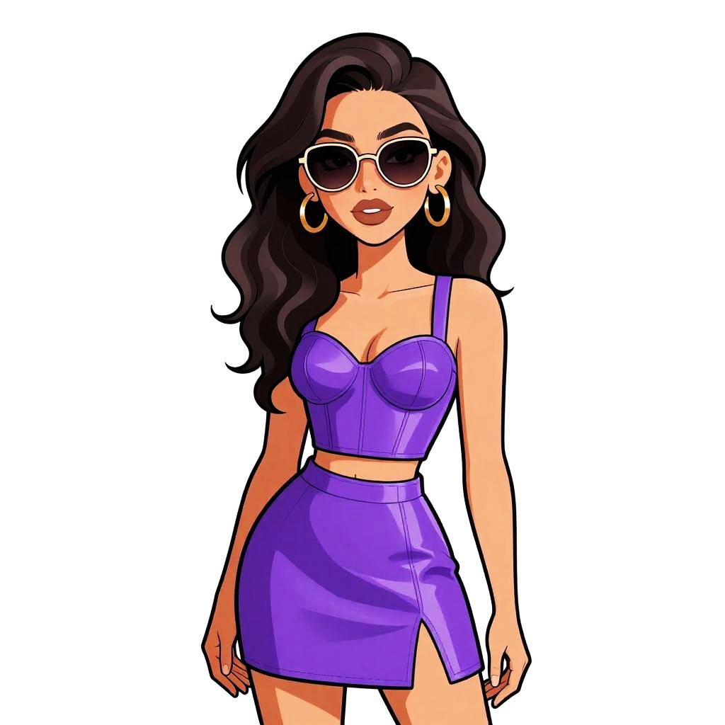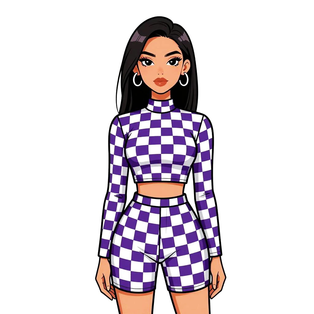 Woman with pretty face and pretty hair. Woman, modern street style, checkerboard print two-piece outfit, mock neck long-sleeve crop top, high-waisted bike shorts, cut-out detail at the midriff, black and white pattern, minimalist silver hoop earrings, sleek pulled-back hairstyle, white studio background. --sref 1467