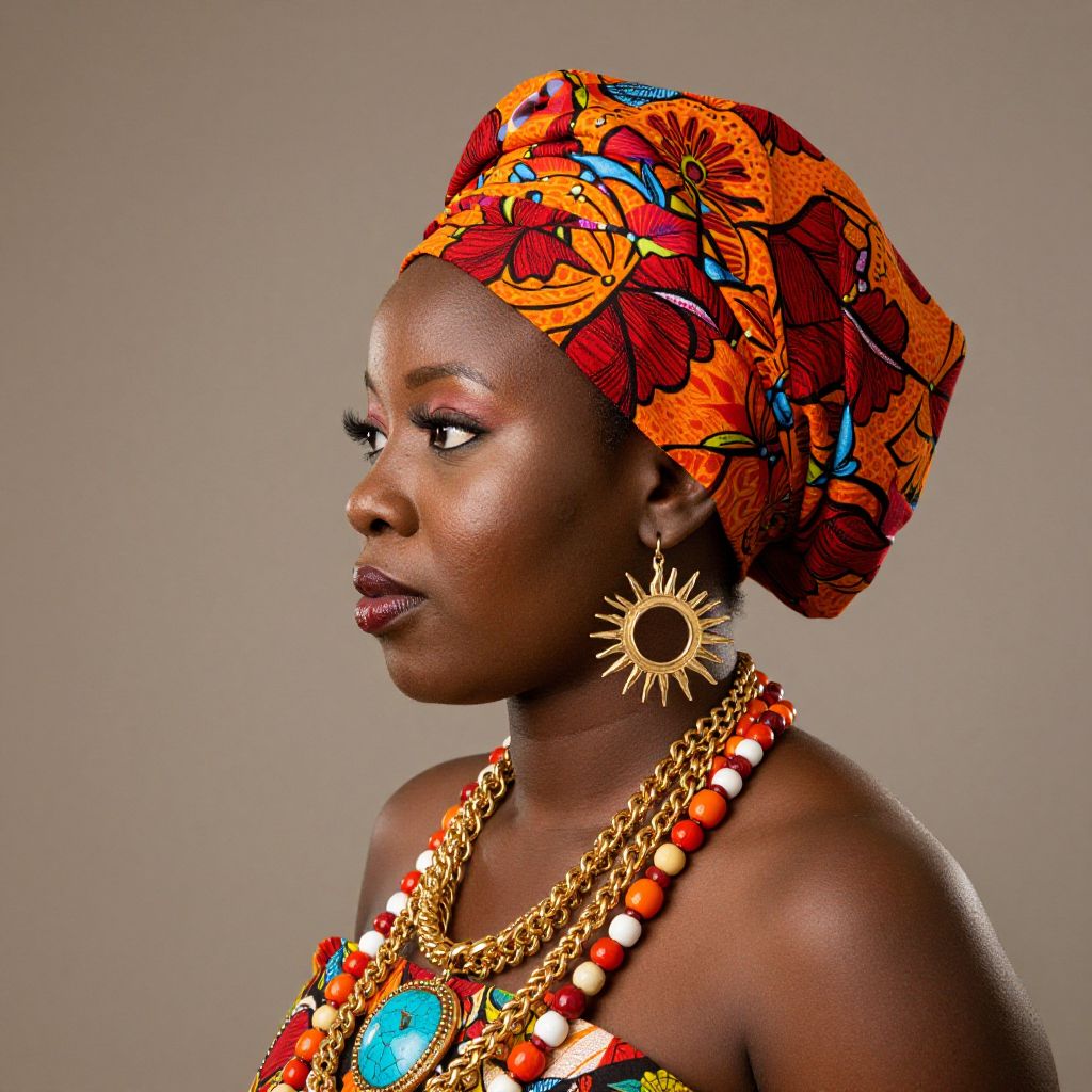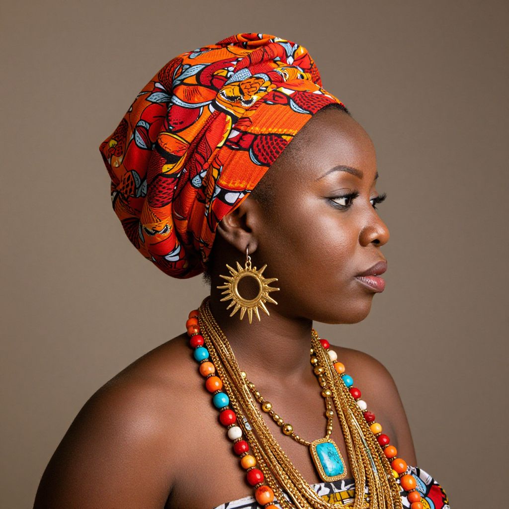 Profile portrait of an African woman adorned with vibrant traditional accessories, including a layered orange and red headwrap featuring floral patterns, a golden sun-shaped earring, and multiple necklaces composed of gold chains, beads, and turquoise stones, set against a neutral background.