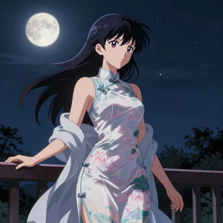 Anime style Hinata cheongsam on a moonlit balcony, delicate silk dress with lotus motifs, soft breeze moving fabric, serene and contemplative mood, high detail, glowing night sky