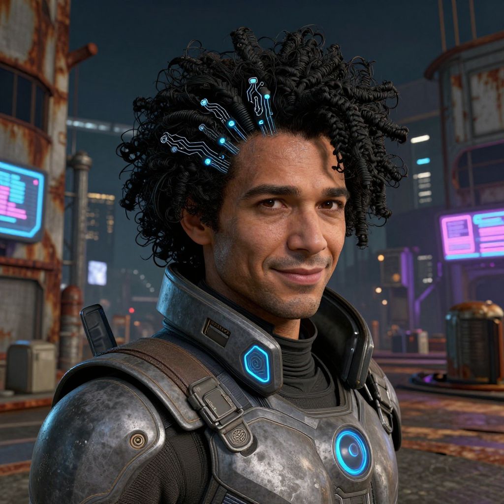 A stylish male with curly black hair and a slightly weathered, friendly face, wearing a futuristic sci-fi costume with a helmet and glowing blue accents, has a complex, layered hair braid design that mimics circuit board patterns. The scene takes place in a post-apocalyptic city at night, with rusted buildings and illuminated holographic signs casting long shadows.