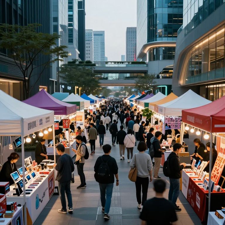 Photograph of a busy evening outdoor market in a city, with white, red, and purple tents selling electronics and goods, surrounded by diverse, casually