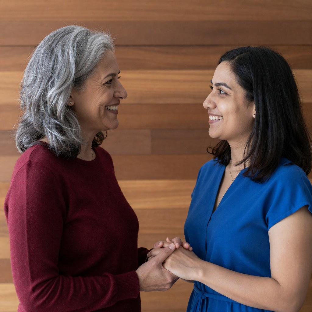 Photograph of two women, one with gray hair in a red sweater, the other with dark hair in a blue dress, smiling at each other while holding hands. Background shows a wall with wooden panels. The gray-haired woman leans slightly forward. Both women have light skin. The dark-haired woman looks up at the gray-haired woman.