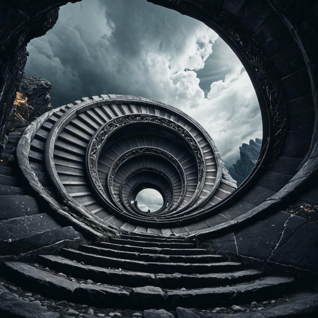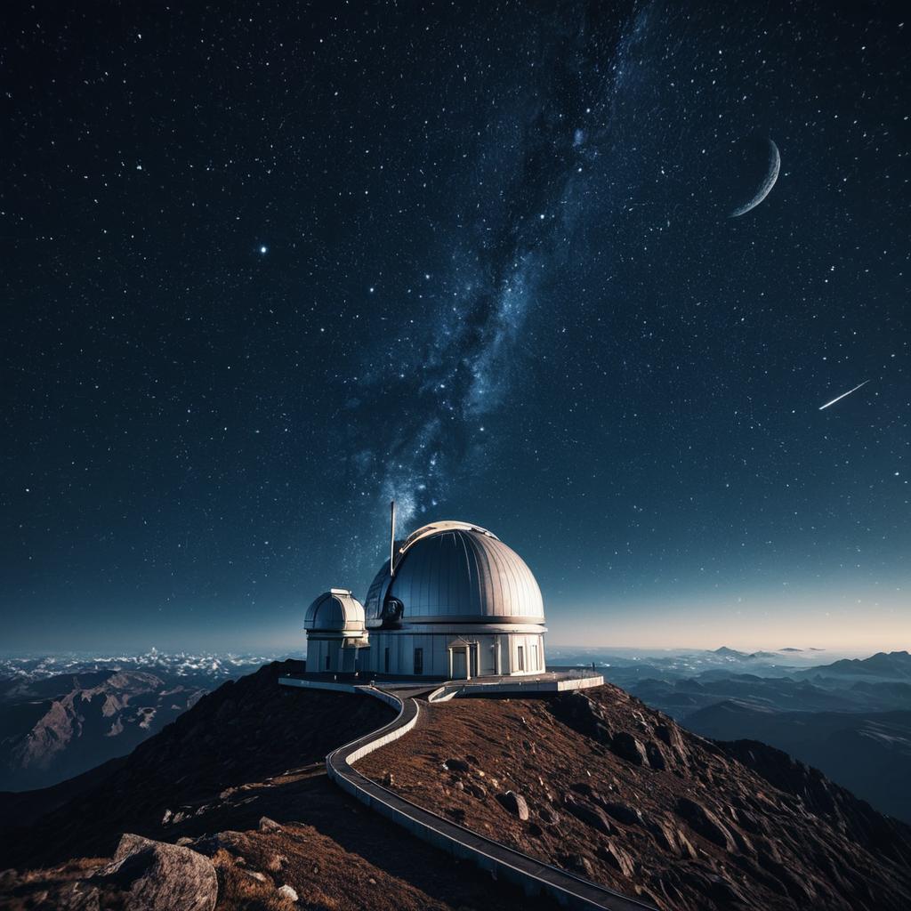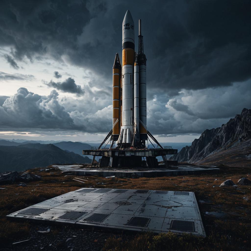 Hyperrealistic image of an abandoned rocket launchpad situated on a mountain top. The rocket stands tall with cloudy, moody evening skies creating a mysterious and interstellar atmosphere. The landscape features rugged mountains and a metal platform in the foreground, with detailed textures and dramatic lighting enhancing the cinematic feel.