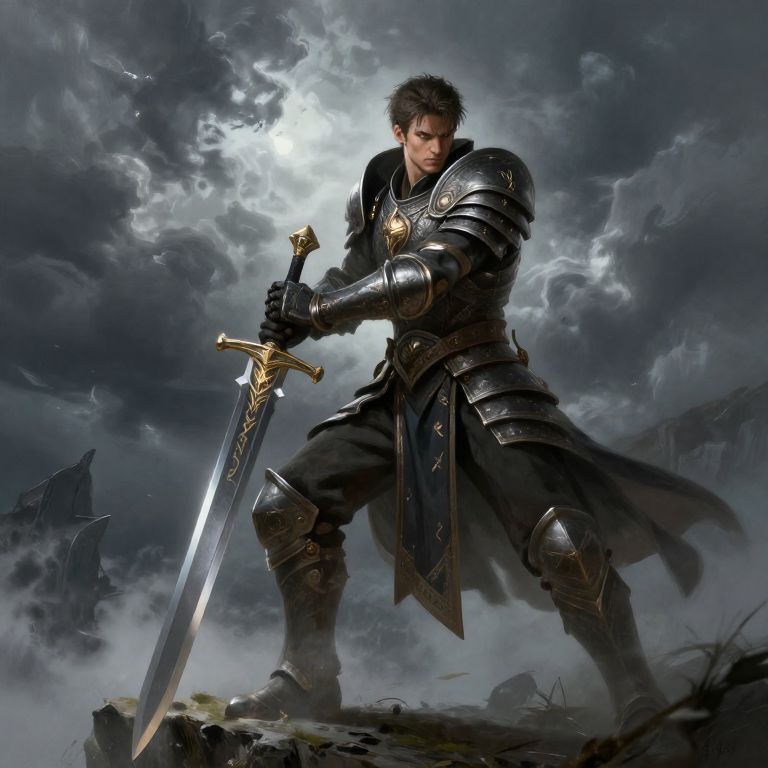 A digital fantasy artwork depicts a muscular, dark-haired man in black, ornate medieval armor with gold accents, standing heroically on a rocky outcrop. He grips a large, gleaming sword with a gold hilt, ready for battle. The background features a dramatic, stormy sky with dark clouds and a bright, piercing light in the center. Mist and rocky terrain surround him, adding to the epic, intense atmosphere. The man's determined expression and powerful stance suggest he is a brave warrior prepared for a significant fight. The image's high contrast and detailed textures enhance its dramatic effect.