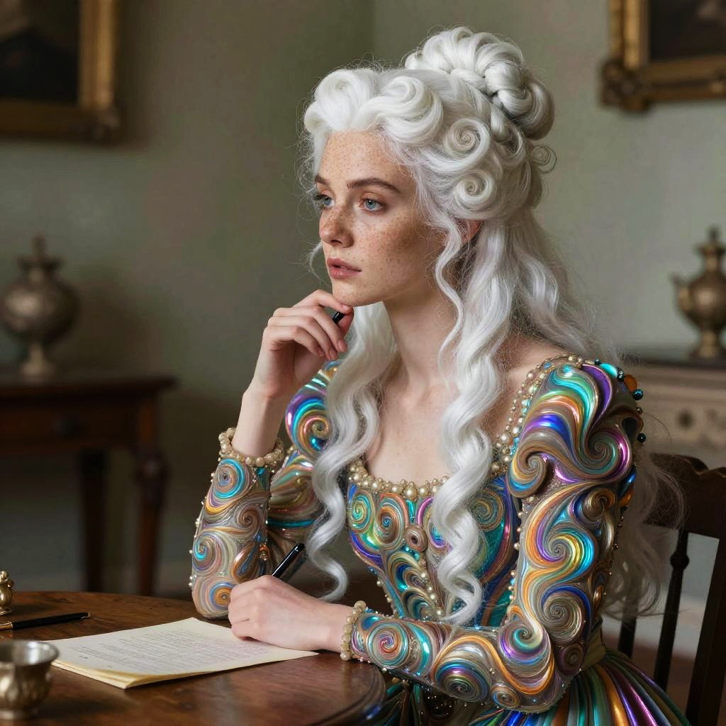 Portrait of a young woman with iridescent white hair styled in intricate curls, wearing a vividly colored, swirl-patterned dress adorned with pearls. She sits thoughtfully at a historic oak table, holding a pen over a document. The image features sharp focus and detailed textures, highlighting her freckled face and elaborate attire in a classic indoor setting.
