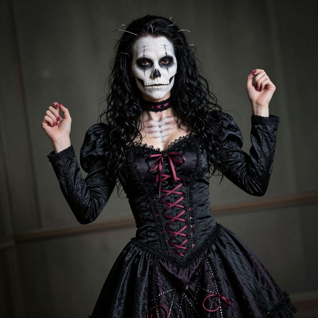 Photograph of a woman with pale white face paint resembling a skull, featuring dark eye sockets and a black nose. She has long, wet-looking black hair with silver spikes. She wears a black, long-sleeved, Victorian-style dress with red lace-up detailing in the front and a full, textured skirt. Her hands are raised with fingers curled, showing red-painted nails. The background is a dimly lit, dark gray room with a wooden trim. The overall style is gothic and eerie, with a strong contrast between the white face paint and dark clothing.