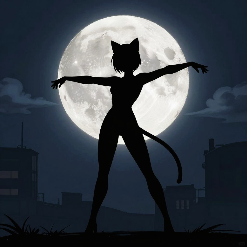 A digital drawing of a silhouetted, anthropomorphic female character with cat ears and a tail, striking a dynamic pose with arms outstretched. She's standing in front of a bright, full moon that dominates the night sky. The background includes dark, shadowy buildings and a few clouds. The overall color scheme is dark blue and black, with a glowing white moon. The character's figure is muscular and confident.