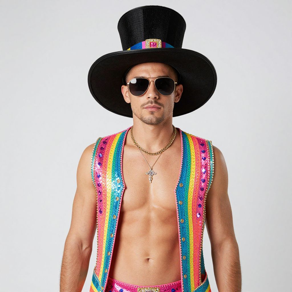 Photograph of a muscular, shirtless man wearing a black top hat, sunglasses, rainbow sequin vest, gold chain, and pink pants, against