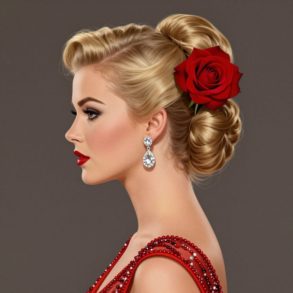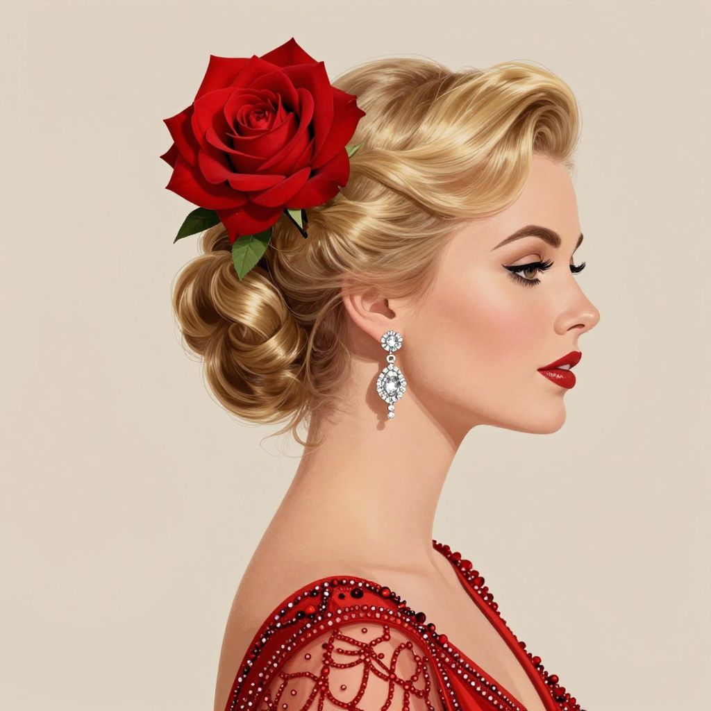 Elegant vintage glamour illustrated through a woman's profile featuring a meticulously styled blonde updo adorned with a vibrant red rose, complemented by sparkling diamond earrings and a red dress embellished with intricate beaded details.