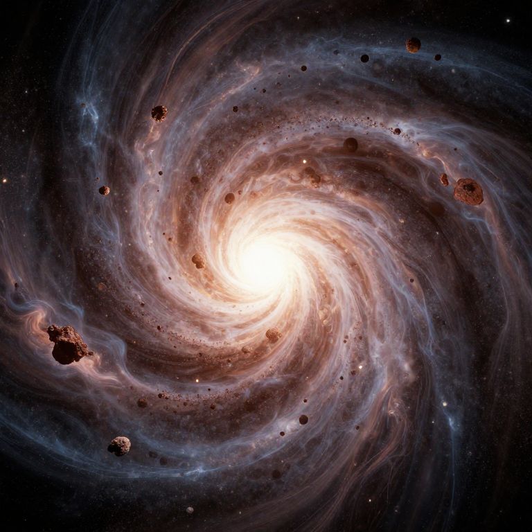 Photograph of a vibrant, swirling galaxy with a bright central core, surrounded by swirling clouds of gas and dust, dotted with red and brown asteroids in