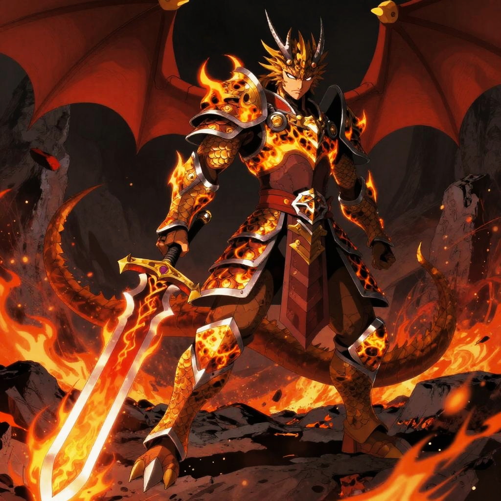 A fearless half-dragon warrior, wearing dragon scale armor with fiery patterns, wielding a massive flaming greatsword, in a volcanic crater surrounded by flying embers, drawn in the dark and stylish anime style of Kouta Hirano.