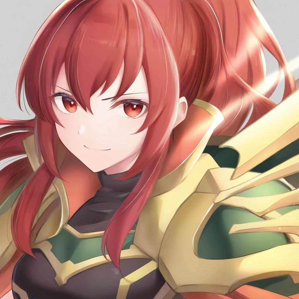 Anna (fire emblem), fire emblem, 1girl, red eyes, hair between eyes, red hair, long hair, ponytail, sidelocks, medium breasts, by artist kakao (noise-111), leet