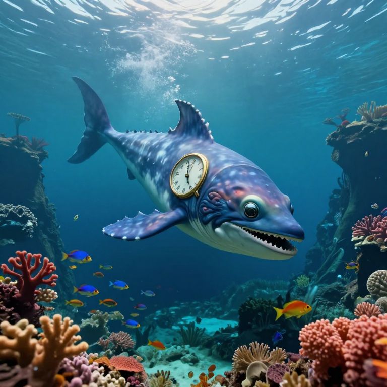 Envision an enchanting underwater tableau reminiscent of Salvador Dalí's dreamscapes, where a regal leviathan, its form crafted from melting clocks and mind-bending shapes, glides through the depths of an oceanic chasm. From a perspective that merges bird's-eye view with worm's-eye view, we witness this colossal creature overshadowing vibrant coral gardens and schools of bioluminescent fish, instilling a sense of amazement as it navigates gracefully through this fantastical realm. The gentle, diffused light emanating from above envelops the scene in an ethereal glow, accentuating the whimsical and enigmatic aspects that defy our understanding of reality while stirring up a spectrum of emotions ranging from intrigue to longing for the concealed secrets hidden beneath the surface.