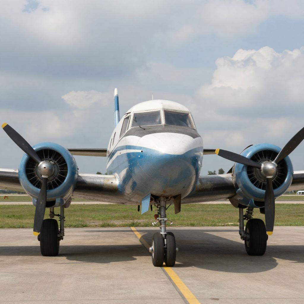 A vintage twin-engine propeller airplane with a weathered blue and white fuselage is parked on a concrete runway surrounded by green grass under a partly cloudy sky. The aircraft's front view shows details of the cockpit windows, landing gear, and spinning propellers. The scene has a nostalgic, serene atmosphere.