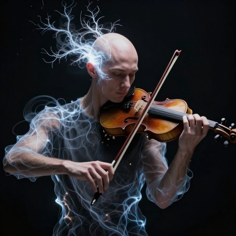 A bald violinist adorned with ethereal, branching tendrils of light emanating from his head defies convention as he plays, weaving an otherworldly symphony of sound and energy.