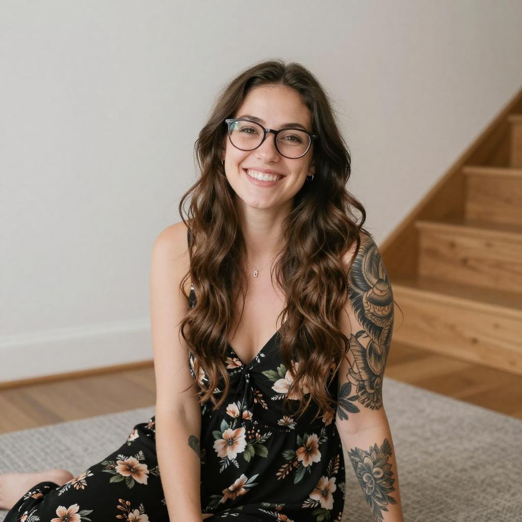 Photograph of a smiling woman with long, wavy brown hair and glasses, wearing a black floral dress. She has extensive black and gray tattoos on her right arm. She is seated on a gray carpet in a bright room with a white wall and a wooden staircase in the background.