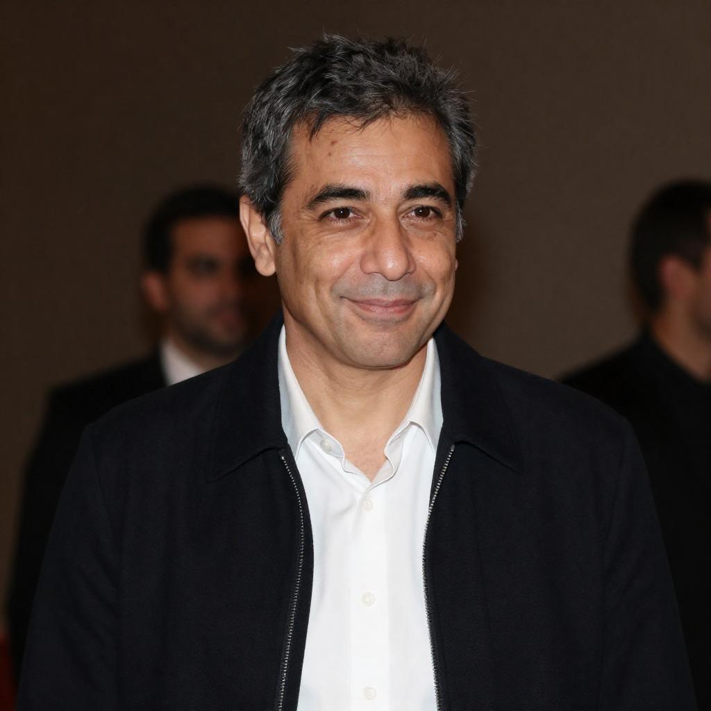Photograph of a middle-aged man with short, dark gray hair and light skin, wearing a black zip-up jacket over a white shirt. He has a slight smile and is slightly turned to his right. The background is blurred with warm, dim lighting and indistinct figures.