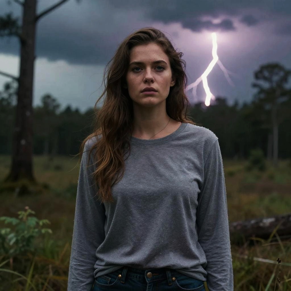 Photograph of a serious-looking Caucasian woman with long, wavy brown hair standing in a dark, stormy forest. She wears a light gray, long-sleeve shirt and blue jeans. Her expression is intense, with dark eyes focused on the camera. The background features tall, shadowy trees and a dramatic, lightning-filled sky with a bright white bolt of lightning striking through the clouds. The forest floor is covered in greenery and small plants. The overall mood is ominous and atmospheric, with the lightning adding a dynamic, electrifying element to the scene.