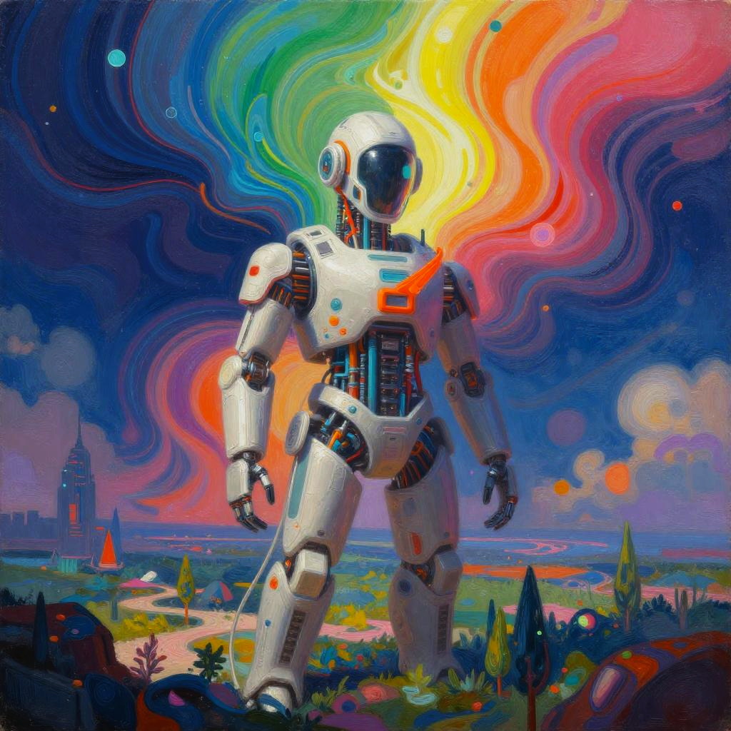 AI art generator with reference image, creating a vibrant digital painting blending futuristic technology and classic art styles, glowing neon colors, intricate details, surreal composition, dynamic brush strokes, high resolution