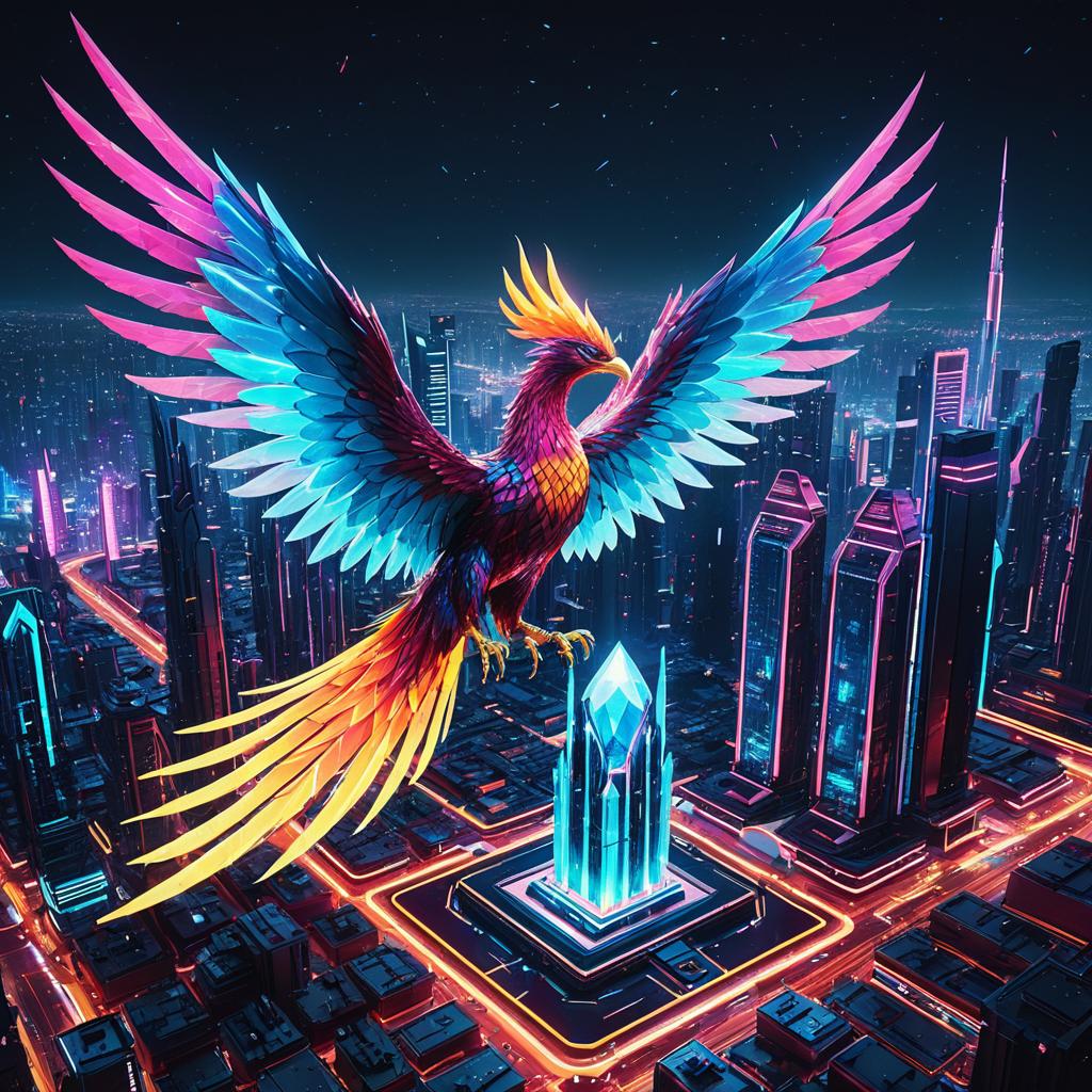 An expansive concept illustration of giant crystal phoenix soaring above futuristic neon-lit city skyline, ultra-photorealistic digital painting with hyper detail and vibrant color palette, style by Beeple and Xue Song, Octane render, 8K resolution, cinematic global illumination.