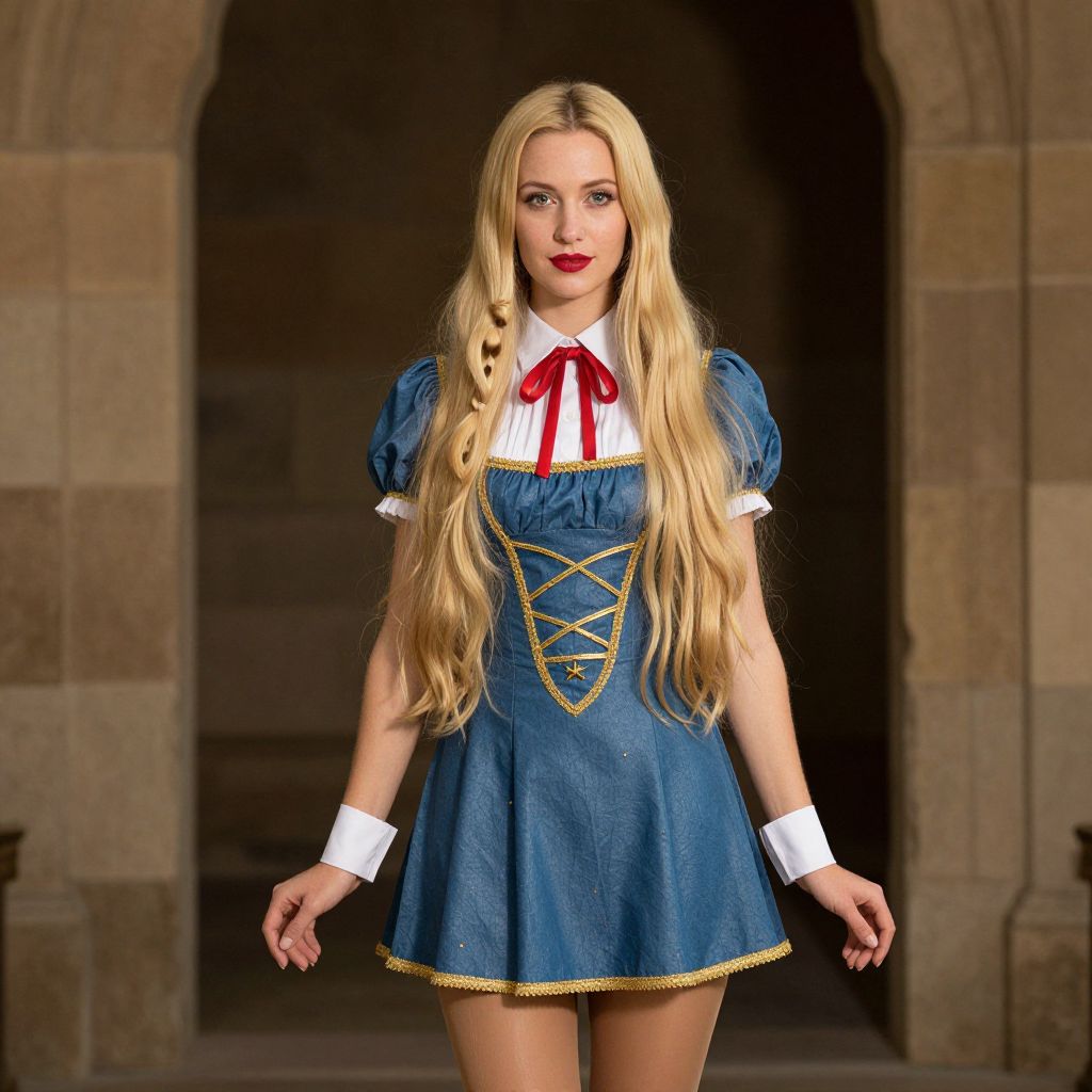 Photograph of a blonde woman with long hair in a blue Alice in Wonderland-style dress, white collar, red ribbon, and gold trim, standing in