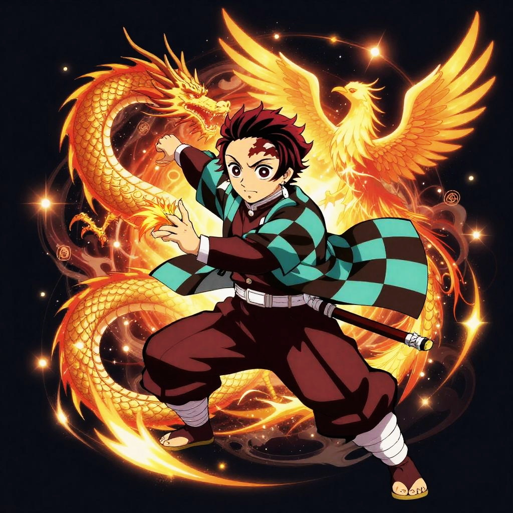 Demon Slayer breathing style generator concept art, mystical dragon and phoenix symbols radiating light, samurai in dynamic pose controlling elemental breath, vibrant color palette with reds, blues, and golds, highly detailed anime-inspired visual effects