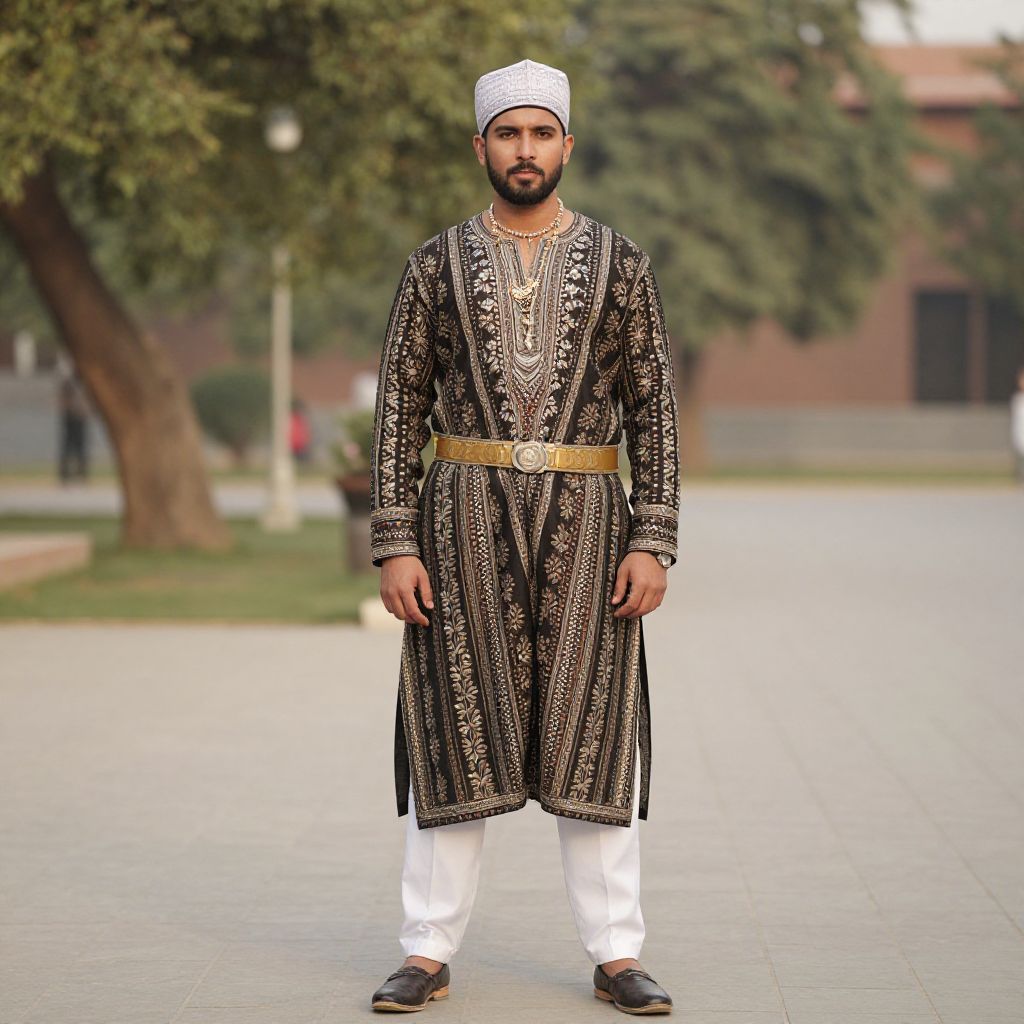 Photograph of a South Asian man standing on a paved path in a park. He has a dark beard and mustache, wearing a white cap, long black and gold patterned tunic with intricate embroidery, white pants, and brown shoes. A gold belt with a large circular buckle cinches his tunic. He stands with hands by his sides, looking directly at the camera. The background includes blurred green trees, a brick building, and a lamppost. The overall style is traditional South Asian attire, with a focus on cultural dress. The lighting is natural, suggesting daytime.