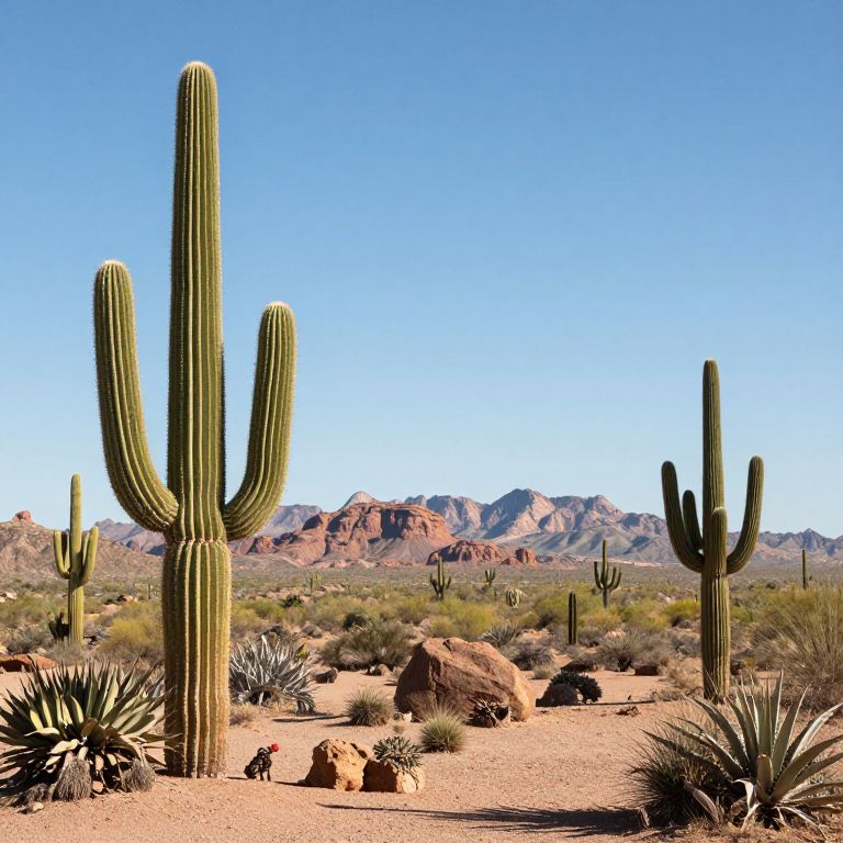 Photograph of a desert landscape with tall, green saguaro cacti, rocky terrain, spiky agave plants, and red rock mountains