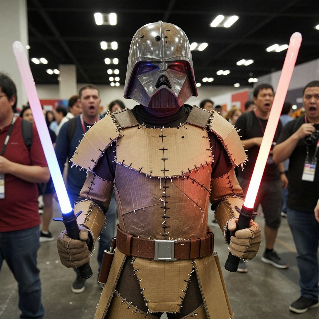 An image showcasing bad Star Wars cosplay with unattractive and ill-fitting costumes featuring rough sewing, scrappy armor made from cardboard, homemade light sabers, set in an overcrowded convention setting with fluorescent lights, exaggerated expressions and playful atmosphere.