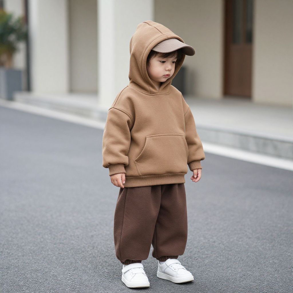 Photograph of a young boy standing on a paved street. He has light skin and short black hair, wearing a brown hooded sweatshirt with a large front pocket and brown baggy pants. He also wears a beige baseball cap and white sneakers. The background shows a blurred, beige building with a dark door and a white light strip on the ground. The street is gray, textured asphalt. The boy stands centered, looking downward with a neutral expression. His outfit is casual and slightly oversized.