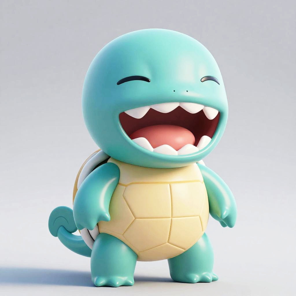 A shiny, iridescent teal plushie Turtle with a cute, chubby body and a wide-open mouth filled with white, rounded teeth and a pink tongue. Its eyes are small and slightly closed, and it has a small fin-like structure on its back. The background is a simple, gradient gray, highlighting the creature's glossy texture and vibrant color. The overall style is whimsical and playful.