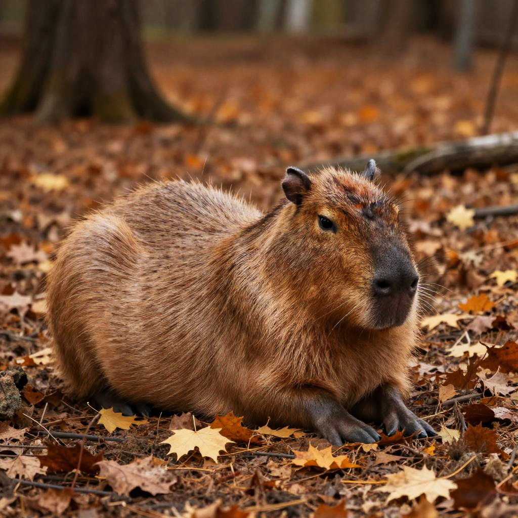 Sad capybara curled up on dry leaves in an autumn forest, warm orange and brown tones, detailed environment, somber mood