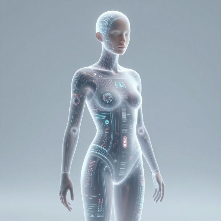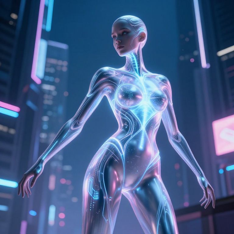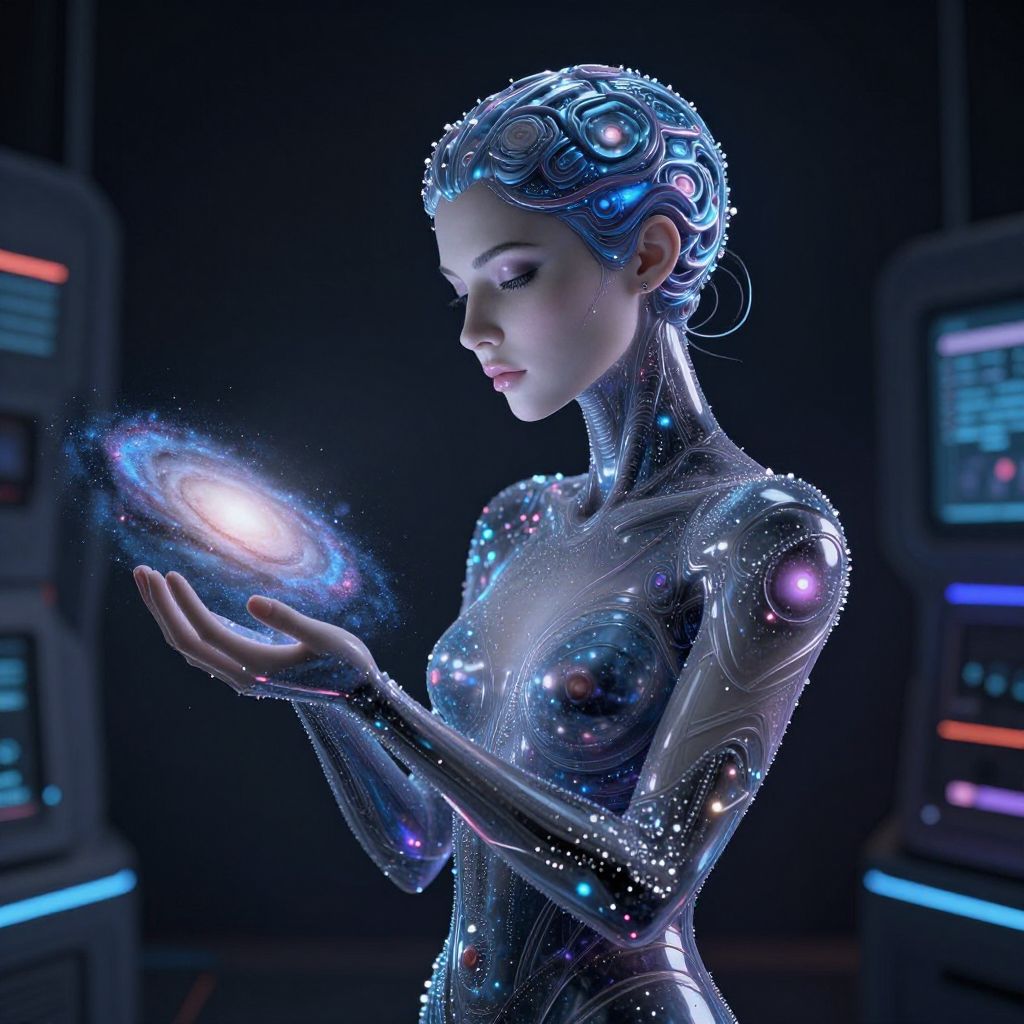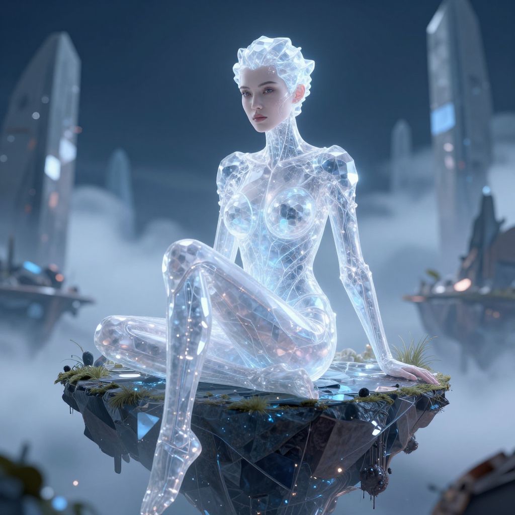 Hot sexy ai prompt: An advanced AI entity with fluid, organic form and shimmering bioluminescence, sitting in a minimalist futuristic room, reflecting on quantum data and floating equations.