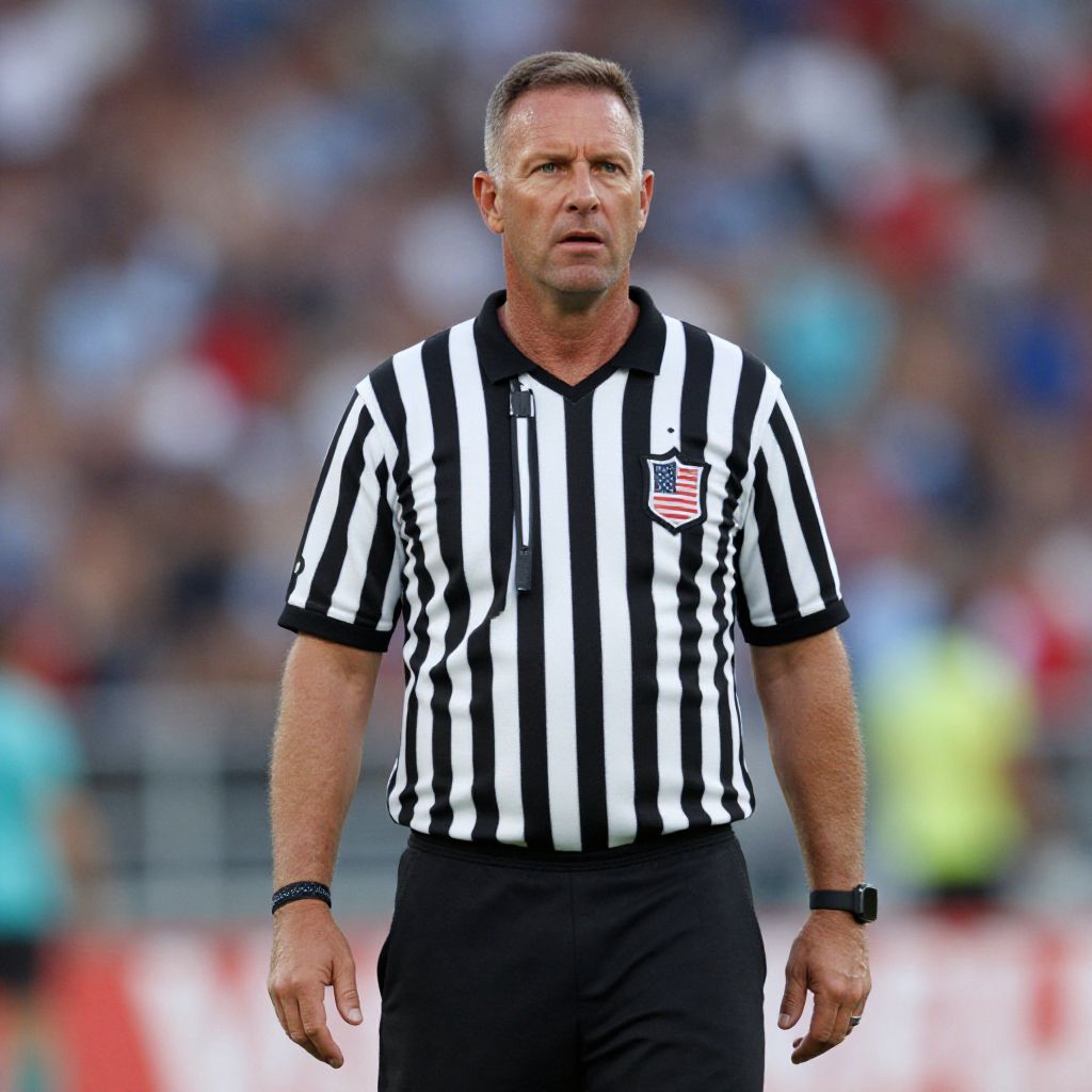 A man dressed in a classic black and white striped referee costume stands outdoors in a stadium, focused and attentive. The photorealistic portrait captures the energy of the sporting event with a blurred crowd in the background.