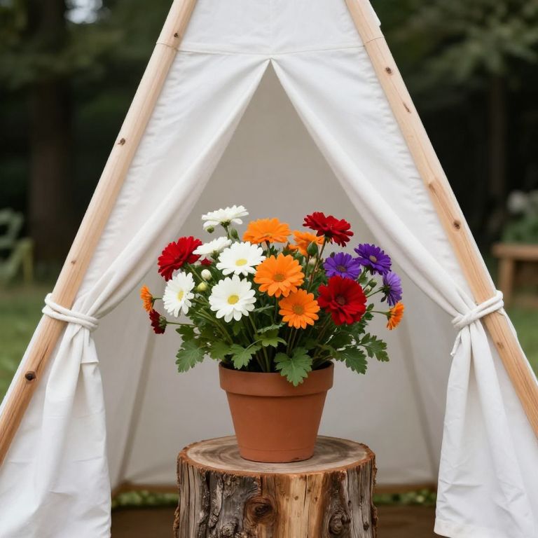 Potted flowers in vibrant hues of red, orange, white, and purple rest atop a rustic wooden stump, framed by the triangular wooden structure and white canvas of a boho-style tipi, captured by Ross Talling Photography.