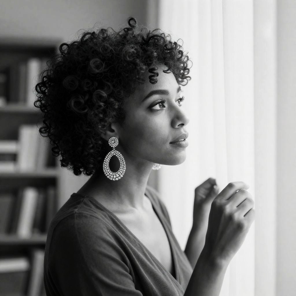 Black and white photograph of a woman with curly, styled hair, wearing large, sparkly earrings, looking intently at vertical blinds. She holds the edge of the blinds with her right hand. She wears a dark, ured top. Background includes blurred shelves. Her expression is curious.