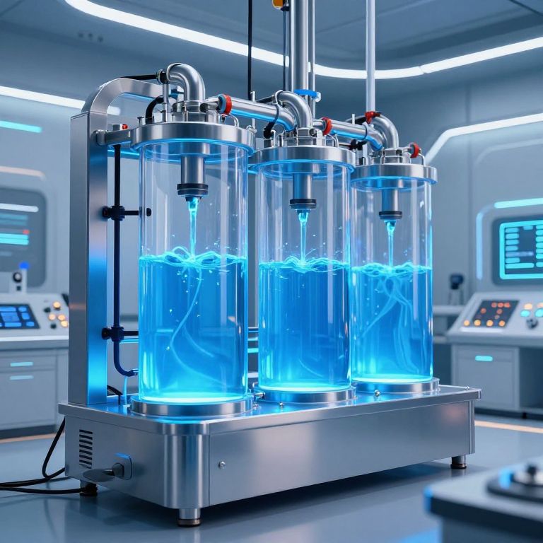 Photorealistic digital CGI image of a high-tech laboratory setting featuring three transparent cylindrical containers filled with glowing blue liquid. Each container is attached to a metal frame with various pipes and valves. The background showcases a futuristic control room with sleek, white walls, illuminated by soft blue LED lights. Multiple control panels with digital displays are visible on the left and right sides, adding to the sci-fi ambiance. The containers are centered in the image, with the glowing blue liquid creating an ethereal, luminescent effect. The overall color palette is dominated by cool blues and metallic grays.