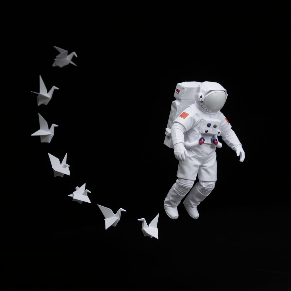Amidst the infinite expanse of darkness, an astronaut crafted from delicate origami drifts serenely, casting a trail of paper cranes that dance like whispers of hope and freedom, each fold a testament to the ephemeral beauty of human aspiration.