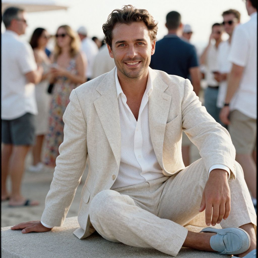 A man, light beige linen suit, crisp white shirt, soft pastel blue loafers, relaxed fit, beachside gathering, chromogenic film, warm smile, soft sunlight illuminating his face. Man has masculine face and piercing eyes