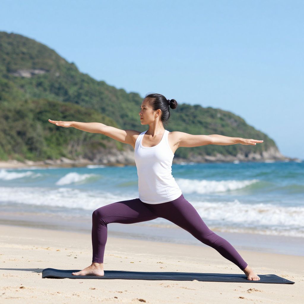 Woman practicing yoga on a sunny beach, striking a warrior pose with arms outstretched against a backdrop of turquoise waves and lush green hills.