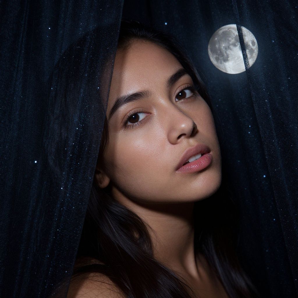 Photograph of a young woman with medium brown skin, long dark brown hair, and full lips with pink lipstick. She gazes slightly to the left with a serene expression. Her face is illuminated by a bright, full moon visible through a sheer, black curtain in the background. The moonlight creates a soft glow on her face, highlighting her smooth skin and delicate features. The dark curtain and background have a slightly textured, velvety appearance, adding depth to the image. The overall composition is ethereal and dreamlike, emphasizing the contrast between the moonlight and darkness.