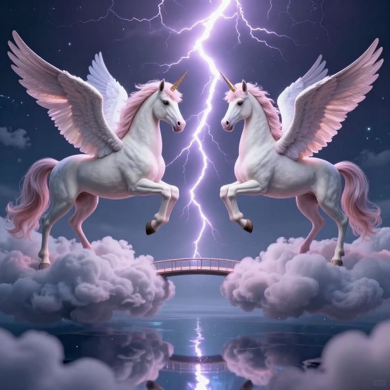 Two winged unicorns stand poised on a shimmering cloud bridge, their hooves suspended above a mirror-like abyss, as a bolt of lightning streaks between them, defying gravity and reality in a celestial dance of myth and magic.