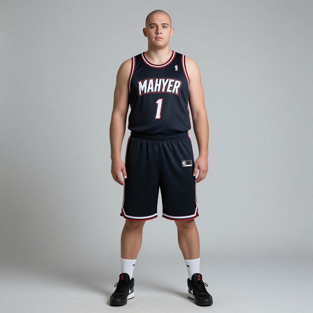 Photograph of a bald, muscular young man in a black "Mavericks" basketball jersey and shorts, standing against a plain white background.